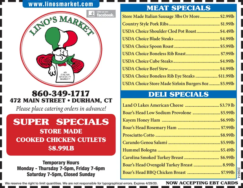 www.linosmarket.com MEAT SPECIALS MARKET Like us on facebook. Store Made Italian Sausage 3lbs Or More . $2.991lb Country Style Pork Ribs.. $1.99lb USDA Choice Shoulder Clod Pot Roast.. .$4.49lb LINO'S USDA Choice Blade Steaks. .$4.99lb USDA Choice Spoon Roast. .$5.99lb USDA Choice Boneless Rib Roast.. $7.99lb USDA Choice Cube Steaks.. .$4.99lb USDA Choice Beef Stew. . .$4.99lb USDA Choice Boneless Rib Eye Steaks . $11.991lb USDA Choice Store Made Sirloin Burgers 8oz . $5991lb TALIAN SPECIALTY MARKEIT 860-349-1717 472 MAIN STREET DURHAM, CT Please place catering orders in advance! DELI SPECIALS Land O Lakes American Cheese $3.79 lb Boar's Head Low Sodium Provolone . $5.991lb SUPER SPECIALS Kayem Honey Ham . $6.99lb Boar's Head Rosemary Ham $7.99lb STORE MADE Prosciutto Cotto . $8.99lb .......... COOKED CHICKEN CUTLETS Carando Genoa Salami $5.99lb $8.99LB Hummel Bologna $5.49lb Carolina Smoked Turkey Breast.. $6.99lb Temporary Hours Monday - Thursday 7-5pm, Friday 7-6pm Saturday 7-5pm, CIlosed Sunday Boar's Head Ovengold Turkey Breast. .8.991lb Boar's Head BBQ Chicken Breast . $7.99lb We reserve the right to limit quantities. We are not responsible for typographical errors. Expires 4/29/20. NOW ACCEPTING EBT CARDS 229614 www.linosmarket.com MEAT SPECIALS MARKET Like us on facebook. Store Made Italian Sausage 3lbs Or More . $2.991lb Country Style Pork Ribs.. $1.99lb USDA Choice Shoulder Clod Pot Roast.. .$4.49lb LINO'S USDA Choice Blade Steaks. .$4.99lb USDA Choice Spoon Roast. .$5.99lb USDA Choice Boneless Rib Roast.. $7.99lb USDA Choice Cube Steaks.. .$4.99lb USDA Choice Beef Stew. . .$4.99lb USDA Choice Boneless Rib Eye Steaks . $11.991lb USDA Choice Store Made Sirloin Burgers 8oz . $5991lb TALIAN SPECIALTY MARKEIT 860-349-1717 472 MAIN STREET DURHAM, CT Please place catering orders in advance! DELI SPECIALS Land O Lakes American Cheese $3.79 lb Boar's Head Low Sodium Provolone . $5.991lb SUPER SPECIALS Kayem Honey Ham . $6.99lb Boar's Head Rosemary Ham $7.99lb STORE MADE Prosciutto Cotto . $8.99lb .......... COOKED CHICKEN CUTLETS Carando Genoa Salami $5.99lb $8.99LB Hummel Bologna $5.49lb Carolina Smoked Turkey Breast.. $6.99lb Temporary Hours Monday - Thursday 7-5pm, Friday 7-6pm Saturday 7-5pm, CIlosed Sunday Boar's Head Ovengold Turkey Breast. .8.991lb Boar's Head BBQ Chicken Breast . $7.99lb We reserve the right to limit quantities. We are not responsible for typographical errors. Expires 4/29/20. NOW ACCEPTING EBT CARDS 229614